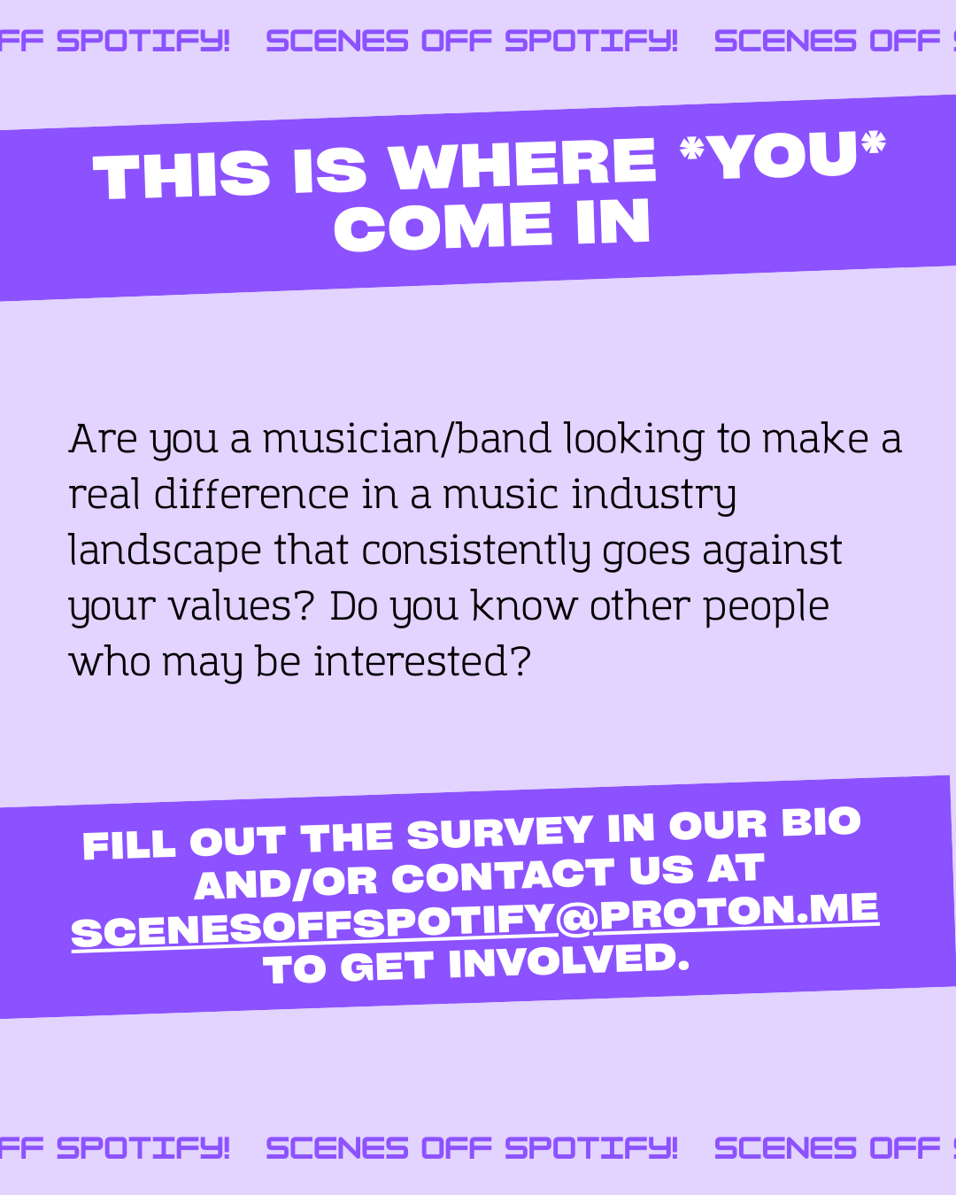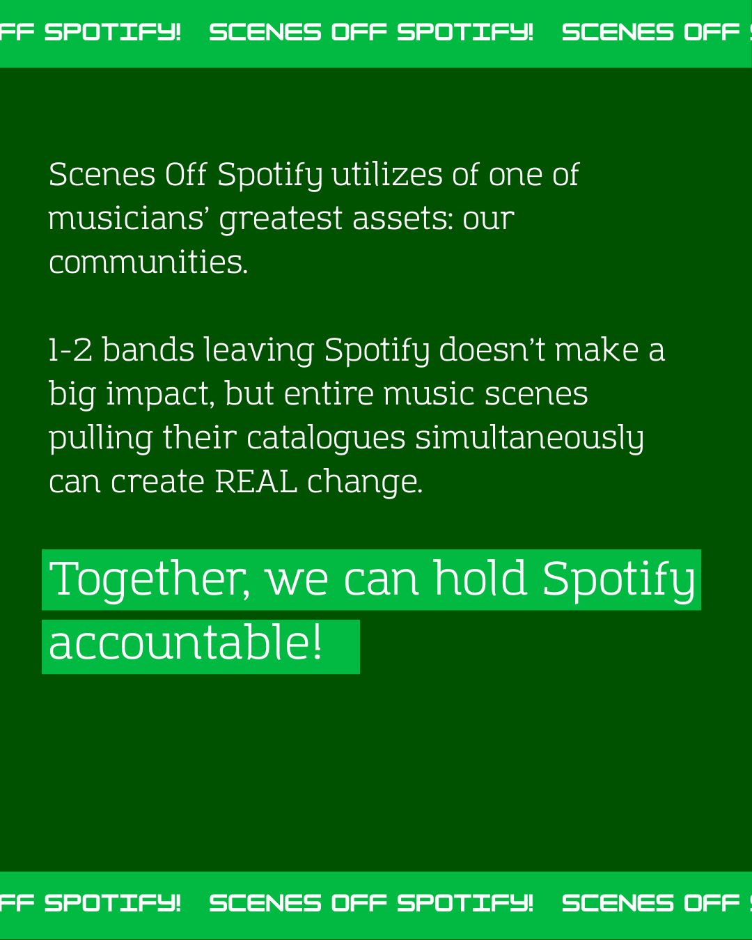 Scenes Off Spotify is a group of independent musicians and organizers working together to help bands and local communities fully divest from Spotify. scenesoffspotify[at]proton[dot]me